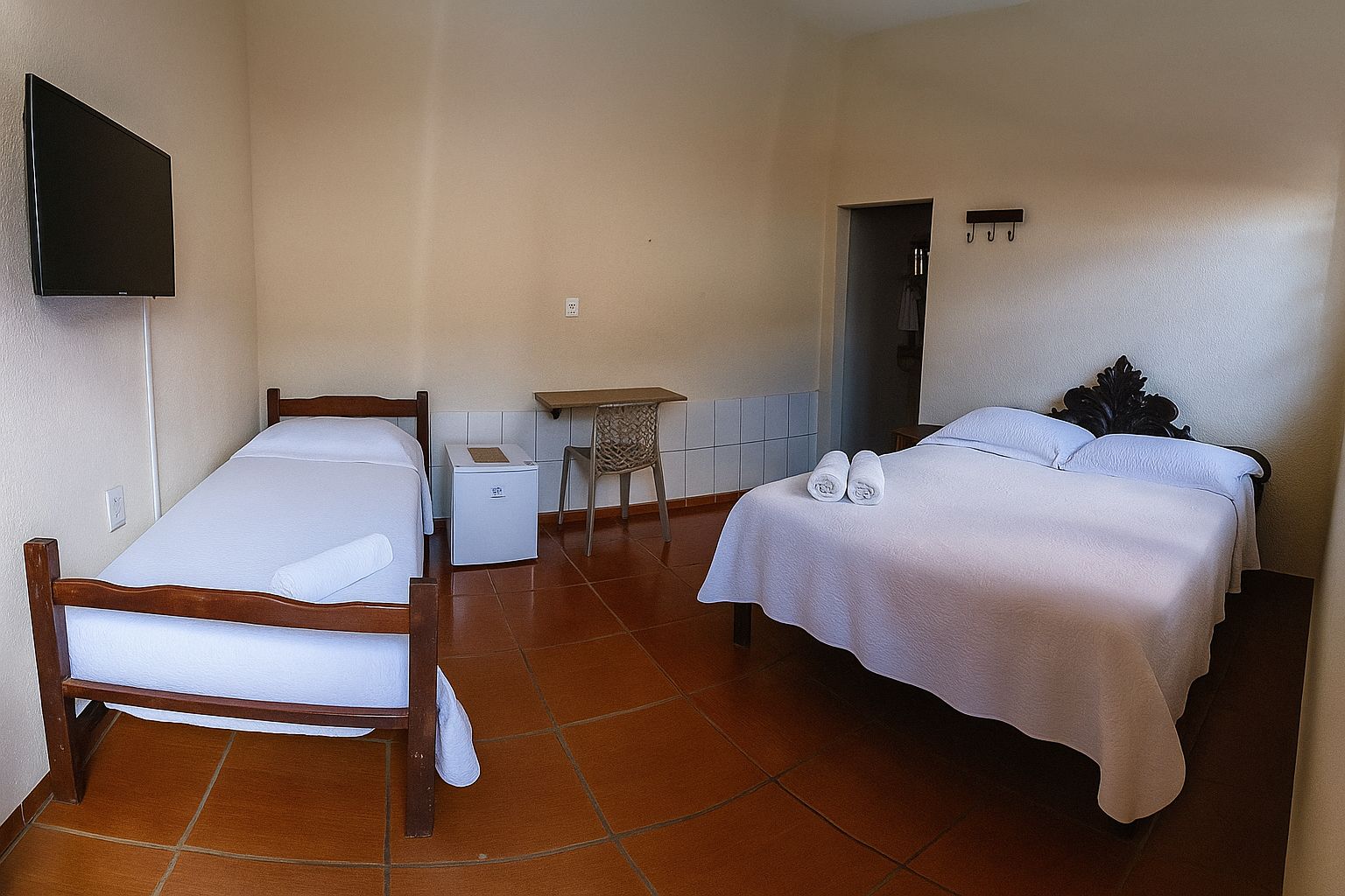 Nossas suítes são equipadas com Smart TV, frigobar e ar-condicionado, garantindo uma estadia acolhedora e funcional. A estância conta ainda com estrutura completa, incluindo piscina aquecida, sauna, quadra e área gourmet, ideal para momentos de lazer e confraternização.