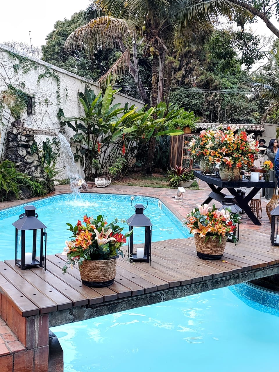 O Jardim Odhara é um espaço com área de 1000 m2, sendo 800 m2 de ária externa, onde fazemos eventos ao ar livre e área coberta (varanda) de 100 m2. No total a casa tem 160 m2. Nosso espaço é muito bem cuidado e lindo, por este motivo somos muito procurados para realização de casamentos ao ar livre. Nossa área gramada é de 250 m2 plana, piscina e Espaço Gourmet. Alugamos também para hospedagem pós evento e feriados.