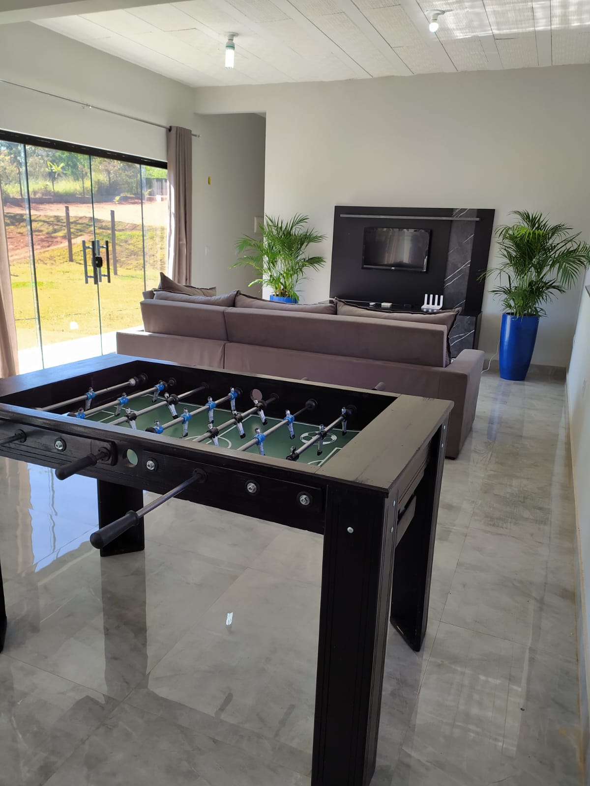 🛋️ Sala ampla com sofá, TV, pebolim e ventiladores de teto.