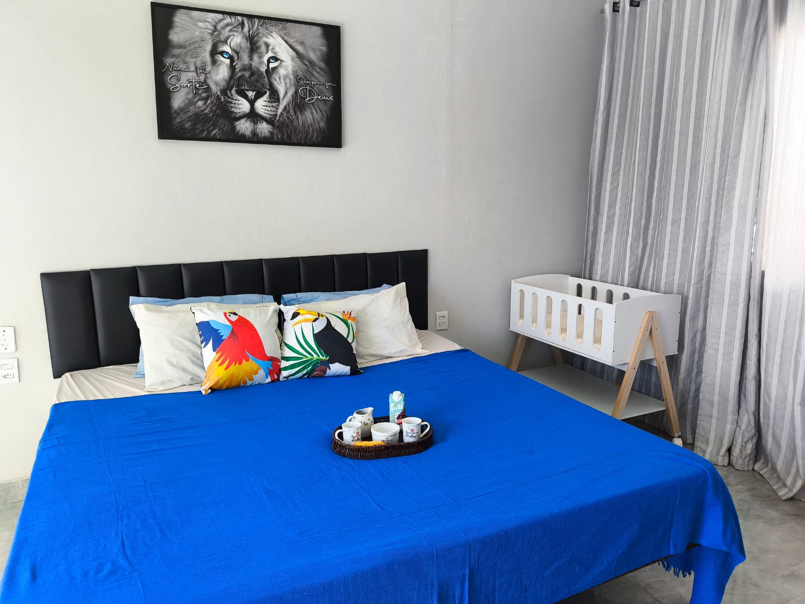 🛏️ 1 quarto espaçoso com cama king, berço, espelho, armário, 2 ventiladores de teto e TV.
