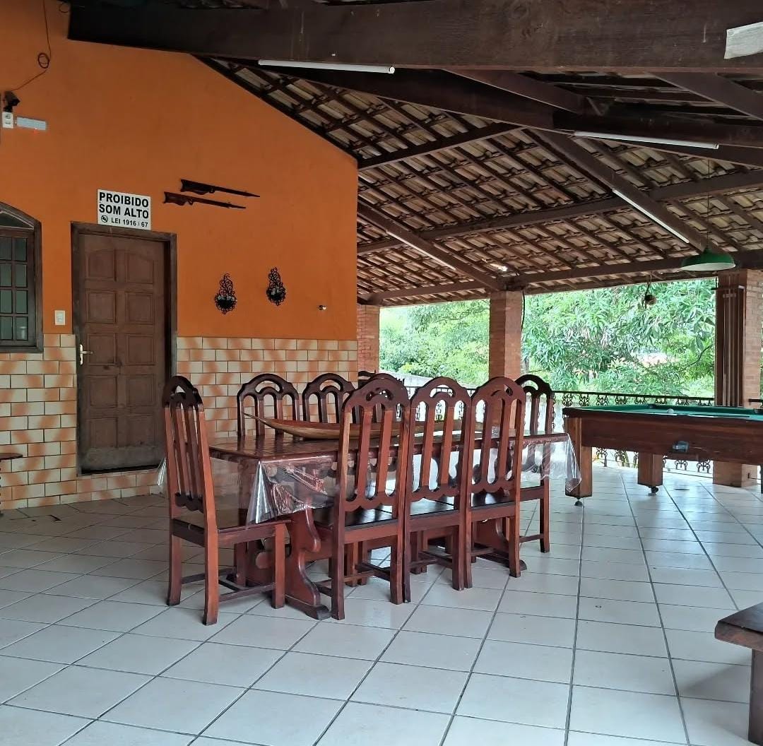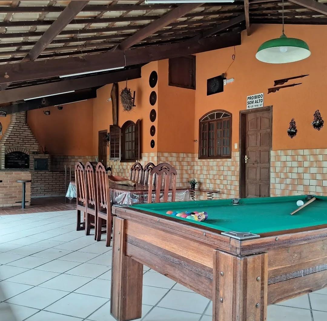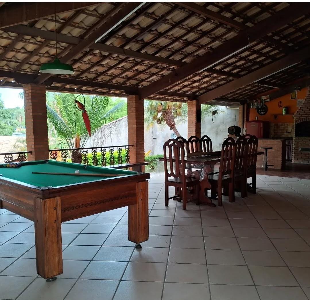 COZINHA um fogão seis bocas,uma geladeira,um banheiro e sala,uma varanda bem grande em três lados da casa,uma churrasqueria e um fogão à lenha com forno e uma sinuca. Mesa grande,uma mesa menor e uma mesa para jogar baralho.