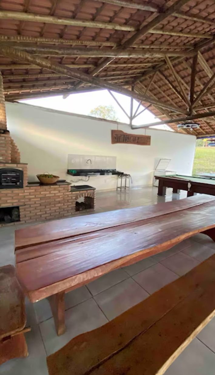 O Sítio com muita natureza, ampla área de lazer, Piscina enorme de 160 metros quadrados, Quadra poliesportiva, Salão de festas com mobília, lago para pesca, casa na árvore, deck, jogos, Espaço Gourmet. Acomodações para até 70 pessoas. Contamos com suíte presidencial, suíte comum, 4 quartos e um dormitório, além de 2 geladeiras, 2 freezers, 3 fogões e conforto completo.
